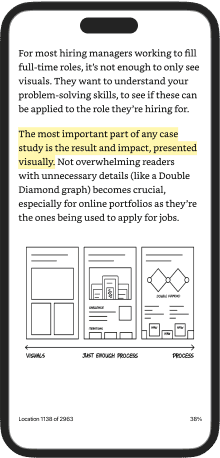 Thank you, Fedor, for this awesome book. I took a short break from design books, but this one reignited my passion. My key takeaways: treat your portfolio like a product, empathize with your users (hiring managers, other designers), and know your KPIs.