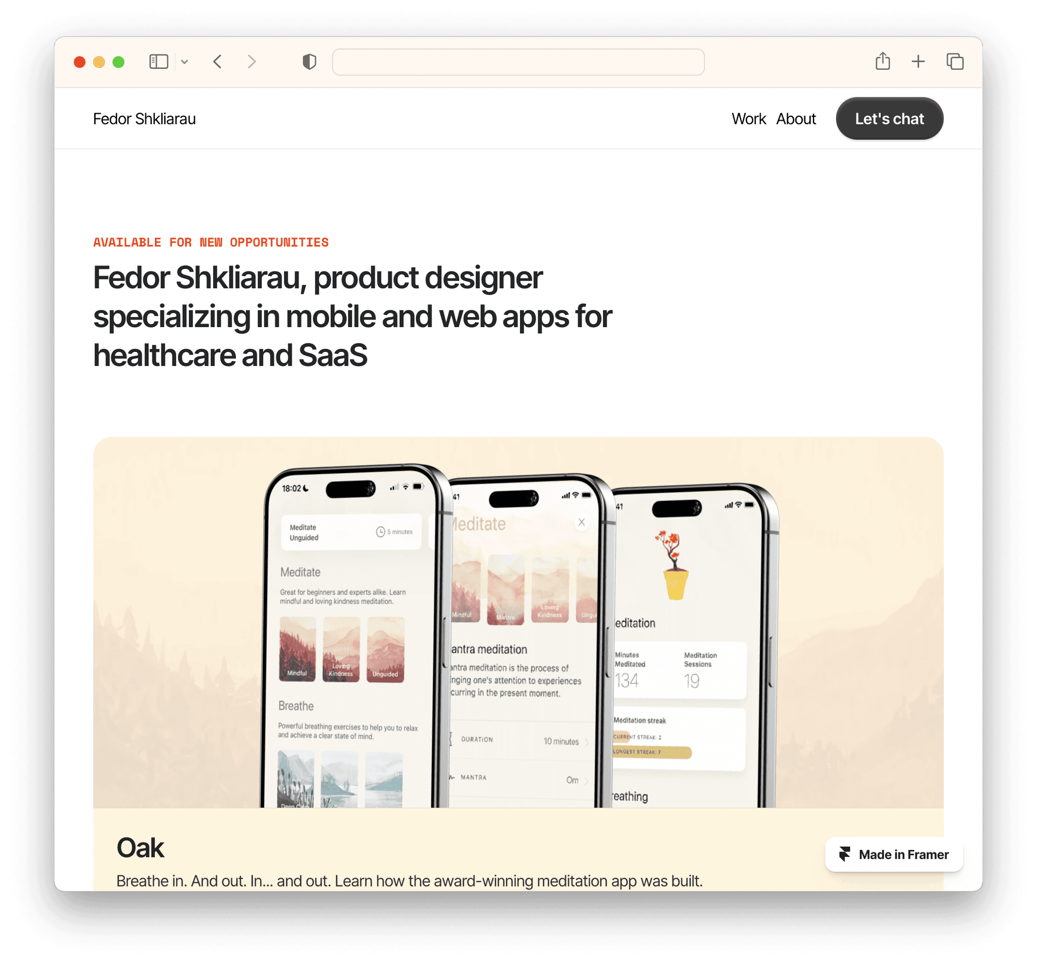 Framer portfolio website template for applying for jobs and portfolio presentation template for portfolio reviews.